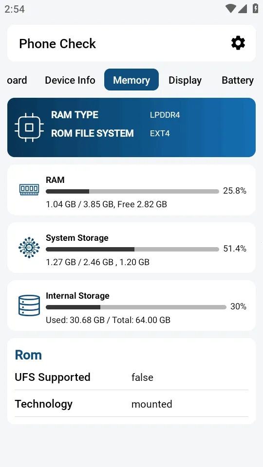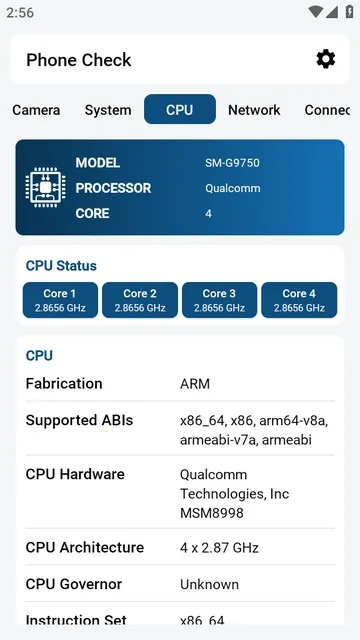 Phone Check是国产免费安卓手机设备检测软件,能实时监控信号硬件,助用户了解设备参数与运行状态。可查基本信息、CPU等,让维修透明,知Root状态。按步骤操作,有测试功能,具备设备检测等亮点。