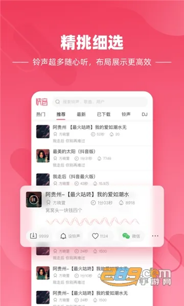 3. 打造个性铃声库,最全最大,无论想要什么铃声都能找到,听到好听歌曲可一键搜索保存。