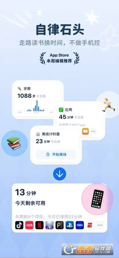 自律石头是一款超棒的自律软件。它功能强大,能帮你养成良好习惯。有应用锁功能,可限制各种软件使用时间,比如你想控制刷短视频的时长,就能轻松做到。还支持自行设置限制时间,满足不同需求。它通过完成生活日常兑换时间,像学习、运动等都能兑换手机使用时长,助你养成好习惯。内置数据统计功能,能实时查看各种时长数据。能智能安排自律时间,合理使用手机。丰富素材可按需选择。高级会员功能能用兑换码免费获取,关注官方小红书账号活动就能拿到。有了它,能摆脱手机依赖,戒掉手机瘾,享受自由自律生活,自定义限制手机使用时长,定制个人方案,让生活更充实平衡,赶紧来试试吧。