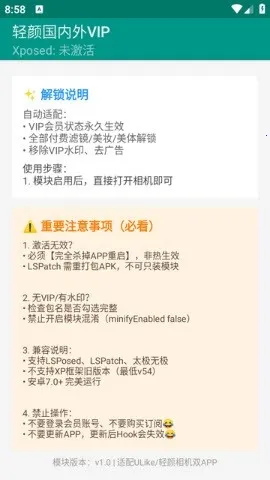 轻颜国内外 VIP 是一款针对轻颜相机的模块工具。**它能免费解锁轻颜国际版和国内版的 VIP**,使用起来更便捷。该模块需搭配 LSPosed 框架,操作简单易上手。启用后能自动适配 VIP 会员状态,永久生效全部付费滤镜、美妆美体,还可解锁移除 VIP 水印、去广告。双版兼容,支持国内版和国际版客户端。使用时按步骤下载安装相关框架和模块并进行设置即可。但要注意激活无效等常见问题,避免更新 APP 导致 Hook 失效。