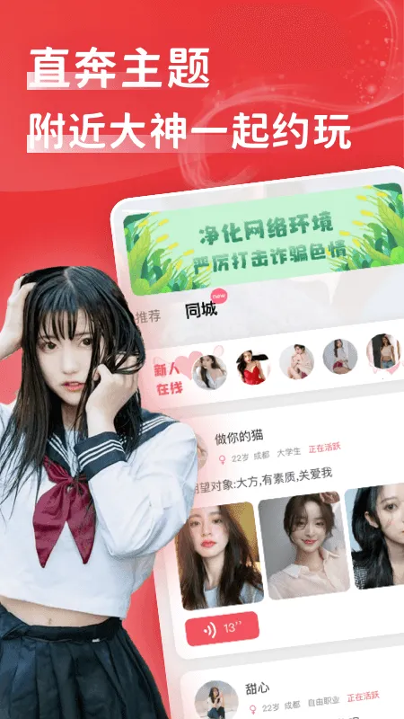 1. 开启定位服务,能查看附近在线用户并互动,附近用户表达直率真诚,可直接邀约聚会出行。