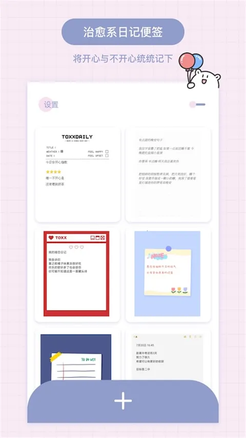 Toxx可爱治愈日记本app界面少女心满满,适合记录心情等。操作简便,支持云同步,数据安全。有多种贴纸、模板,可随意切换。能帮你记录重要日子,通过桌面插件展示倒计时,不断更新优化。