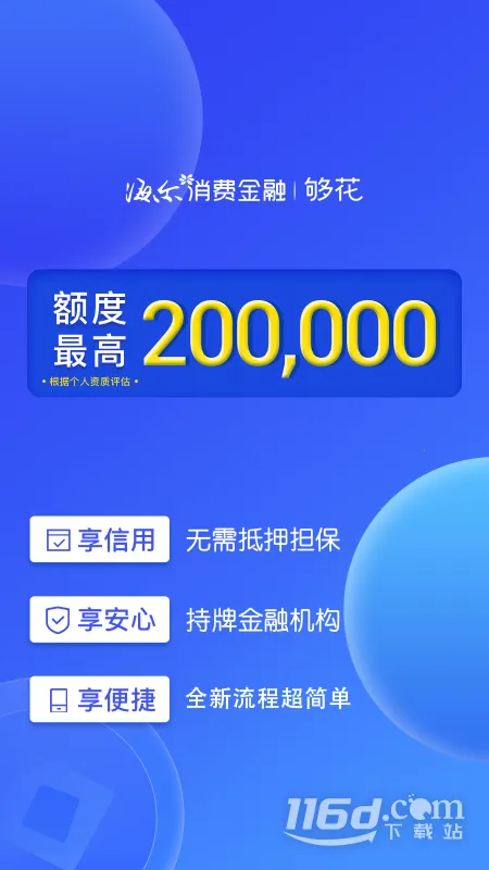 够花海尔消费金融是一款财务管理和记账助手应用。它能帮您轻松管理个人消费理财与预算。您可以轻松记录每日消费,快速生成报表和图表,了解自身消费习惯。还有智能预算功能,根据您设定的目标,实时监控并提醒消费情况,助您控制开支,实现理财目标。其放款快,自动审核即时到账;费用低,实惠便捷轻松还款;额度灵活,最高可贷20万,预支工资能拿月薪50%。常见问题方面,还款方式有银行代扣,支持的银行有明确限额规定。分期申请通过后,销售会提供还款指引,还款日一般为每月12日,还款日前3天会推送提醒。这款软件功能实用,能满足您的用钱需求,且操作简单,福利多,值得尝试,不用担心它是否正规啦,快来下载体验吧。