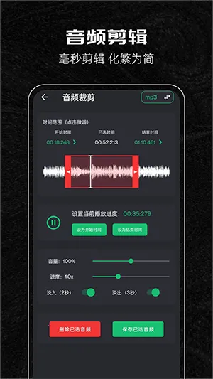 2、操作简单:零基础用户也能轻松上手,通过简单操作即可完成各种音频编辑,如裁剪、调节等。