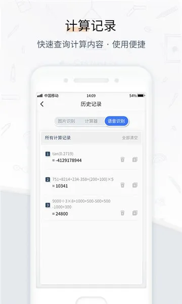 3. 历史记录:自动保存计算结果,向左滑动就能查看,长按还能复制到当前计算栏继续用。