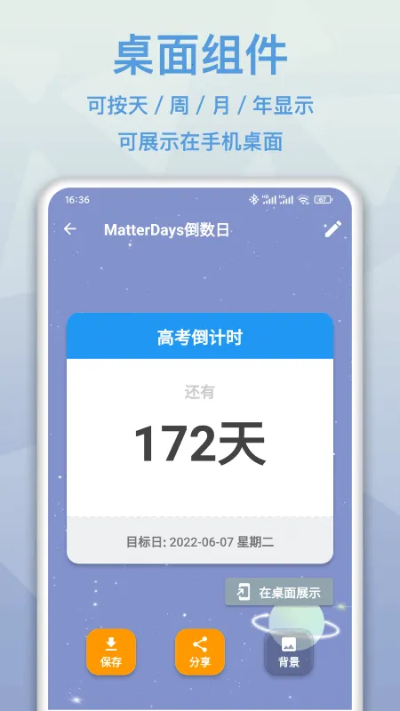 个性化定制:能自定义事件背景,默认包含了生日本生活工作和学习三个倒数本,还可以自定义更多分类,提供了多种主题可供选择,让用户可以根据自己喜好进行个性化设置。