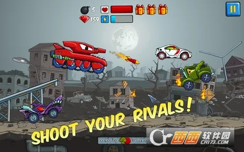3、道具系统庞大,玩法丰富多样。游戏具备庞大道具系统,玩家不仅可以收集升级道具来提升车辆性能,还能射击敌人,利用山丘跳跃演出惊人特技赚取额外加分,花式开车完成高难度动作,收集红宝石等,玩法丰富。