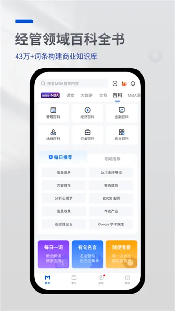 如果你想学习经济管理领域知识,提升职业能力,MBA智库APP绝对是个不错的选择。它由厦门众智创库企业管理咨询有限公司打造,聚集了超1000万企业管理者、创业者、专家学者及MBA学生等。这里有大咖讲百科,为你深入浅出讲解知识点;智库课堂提供职场管理类在线微课程,助你加速职业成长;智库百科让你随时查阅经管百科词典;智库达人闯关答题,让学习充满趣味;智库资讯每日推送精选财经热点及管理文章。软件功能丰富,能开通VIP特权、购买课程资源、每日学新词汇、挑选名言、更换推荐内容、搜索百科知识等。还涵盖不同领域百科知识,有丰富大咖专题栏、多样资讯获取专区,汇集多种内容资料。有了它,学习经济管理知识更轻松,升职加薪不再是梦,快来下载吧!