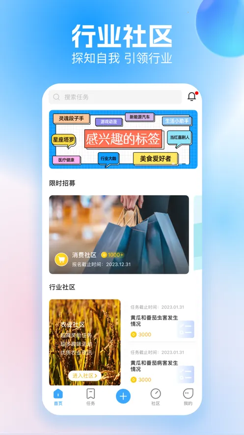 4. 立足于数据驱动行业创新,以行业和品牌定制社区模式汇聚专业人士,用户完成任务可探知自我、交流经验、获取收益,还有机会与品牌对话。