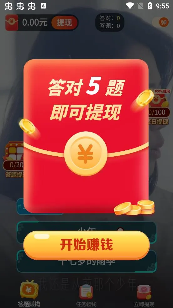 想通过刷手机轻松赚钱吗?金曲刷刷app就能满足你!这是一款超棒的视频听歌答题应用。它有海量丰富的歌曲资源,让你边看边听边互动。每看一条视频都能获得金币奖励,金币还能兑换现金直接转到微信,轻松赚取零花钱。还有开宝箱、每日抽奖等活动,轻松度过碎片时间就能赚钱。这里视频分类详细且更新快,各种金曲视频集锦,简单又有趣。通过互动答题,既能享受乐趣,又可能收获惊喜。经典老歌唤起回忆,大众嗨曲感受自由,网络情歌回味青春,国际流行领略无国界经典。它能满足你听歌、娱乐、赚钱的多种需求,新用户还有现金红包奖励哦。快来下载金曲刷刷app,开启你的赚钱娱乐之旅吧!
