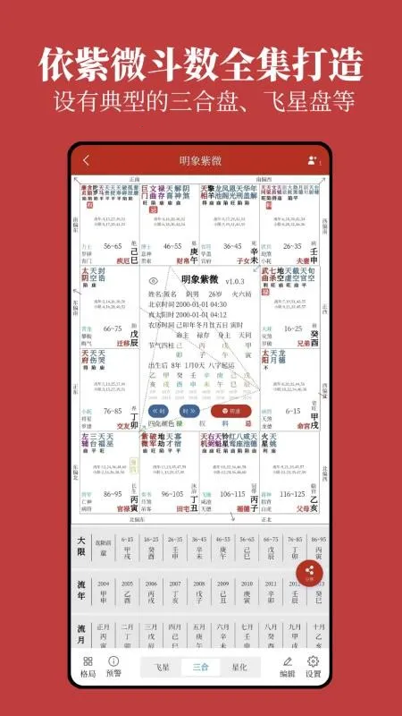 你是否想深入了解紫微斗数?明象APP就能满足你的需求!它是一款超棒的紫微斗数软件,功能超全面。在这儿,你能详细查看诸多紫微信息,包括大限流年、流月等,提升对传统文化的认知。它有清晰明了的飞星转数图和星化盘,能让你实时知晓飞星详情,还能查看预警图及说明。支持自定义选择飞星三合或星化体验,信息更详细全面。能自由编辑,达到最佳使用效果。还可在线分享,让亲友也了解紫微斗数。强大的云端储存功能,能安全保存所有数据,方便你随时随地查看。不管是分析命理,还是应对大限预警,亦或是个性化管理需求,明象APP都能轻松搞定,快来本站下载免费版体验吧!