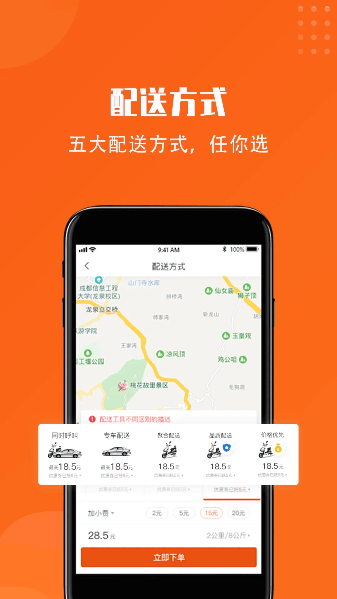 3、品质提升:以最优表现为用户服务,提供专人直送、同城跑腿等多种业务,提高配送服务品质。