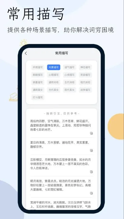 3. 常用描写:解决词穷困境,提供各种场景描写,让写作更流畅。