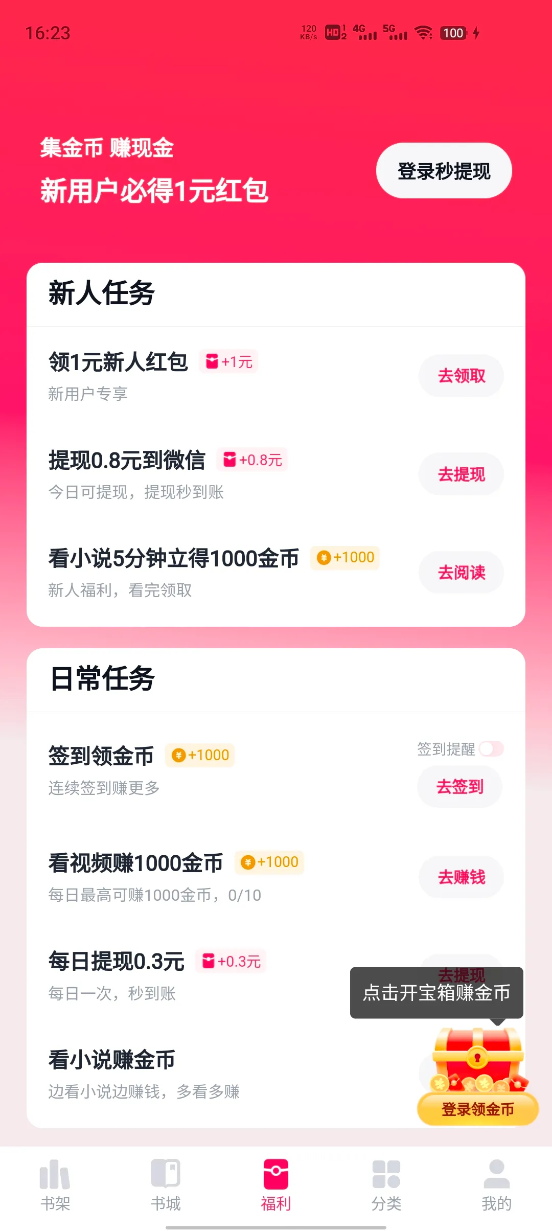 4. 福利多多能赚钱:新用户有现金红包,每日签到阅读赚金币,金币提现秒到账,看越多赚越多
