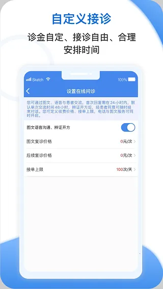 3、灵活接诊与收益:诊金自定,接诊自由,医生可根据自身时间安排接诊,实现工作与生活的平衡,还能合理分配收益。