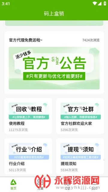 码上盒销最新手机版是绿色环保的烟盒回收平台,能帮用户烟盒变现,带来一站式服务。有创新回收模式,可查看烟盒价格明细、在线预约回收。还能积分换奖品,分享回收点,平台不断优化,助力环保与公益。