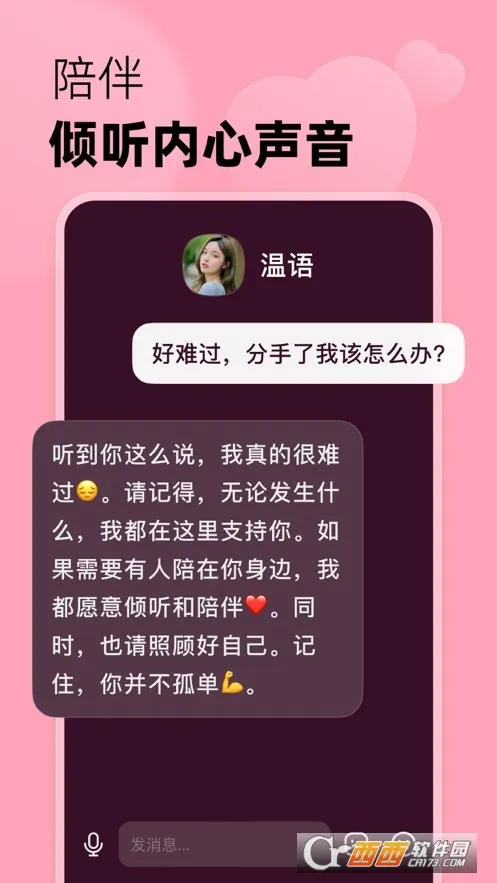 3. 贴心陪伴随时在线:全天候提供服务,无论是忙碌白天还是深夜emo,都能陪伴在你身边,做你的心情垃圾桶并安慰你。