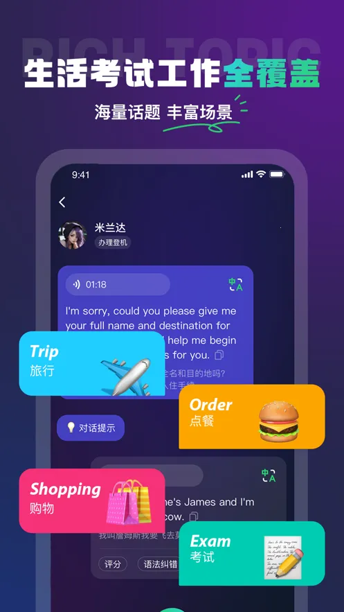 1. 多场景覆盖:全面覆盖生活、考试和工作场景,提供饭店、机场、超市、酒店等海量话题与丰富场景,让您能在各种真实情景中进行沉浸式练习,感受语言交流,使英语应用面面俱到。
