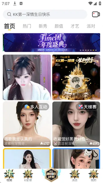 KK直播是一款主打高颜值互动的视频社交平台,核心是为用户提供沉浸式互动娱乐体验。它涵盖24小时不间断的多元直播内容与丰富社交玩法,依托严格内容审核机制,打造健康绿色的社交环境,能满足用户才艺观赏、游戏互动、同城交友等多元需求。在这里,你可以尽情享受各种精彩直播,与众多有趣的人互动交流。无论是想观看精彩才艺表演,还是结交志同道合的朋友,KK直播都能给你带来不错的体验。它为用户搭建了一个充满活力与乐趣的社交空间,让大家在其中收获快乐与满足。
