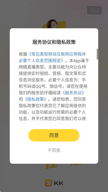 1、打开KK软件,点击同意隐私政策