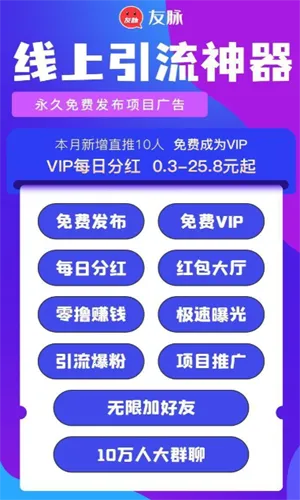你是否在寻找一款能助力拓展人脉、增加收益的软件?友脉 app 就是你的绝佳选择!它是专为电商打造的管理服务平台,能帮你推广商户,搞定人脉,一个应用就能搞定各种营销。对于商户来说,它可带来更多资源和客户,扩大效益。而对于个人,能自由接单赚取更多收益。这里每天任务内容丰富,能满足多样兼职需求,不同任务划分详细,在大厅就能看到所有任务信息,且所有任务在线就能完成,足不出户体会兼职乐趣。玩法简单,还能在平台领略世界各地风景,旅游中提升等级,等级越高赚金币越多,金币直接进账户,随时查看明细。作为线上引流推广工具,它非常实用,利用人脉就能赚取零花钱,很适合学生党和自由职业人,轻松解决大家拓展人脉与增加收入的需求。