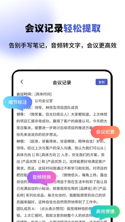 4. 自动分段功能,根据语音内容自动生成段落结构。