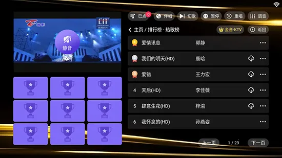 它的曲库海量,覆盖流行金曲、经典老歌、抖音热歌、外语歌曲等,还每日更新热榜新歌。支持智能搜索,按歌名、歌手、语种、年代等分类检索,还有首字母拼音搜索和手写输入功能,点歌效率超高。部分版本支持语音点歌,说出歌名就能快速播放。电视端安装软件后,可通过手机微信扫描二维码进入小程序远程点歌。而且下载安装好就能免费使用,所有歌曲和MV均开放点播。有了它,唱歌变得轻松又有趣,快来下载享受吧! 关于安装教程,一般下载站提供的版本下载安装好后即可免费使用。你在下载站找到金音KTV点歌系统的安装包,点击下载并按提示步骤完成安装就行啦。
