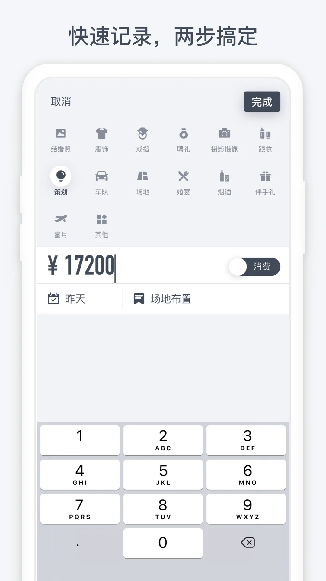 1. 操作简便,两步即可完成一笔记录,快速记账无压力。