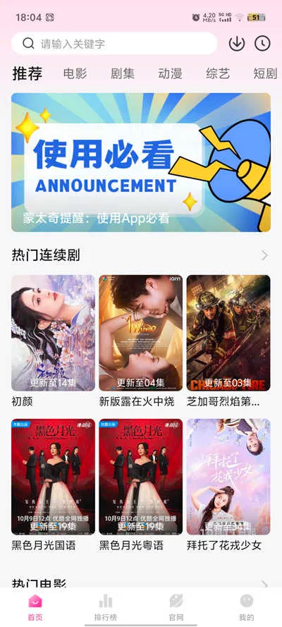 蒙太奇影视是安卓影视应用,资源丰富,涵盖剧、综、动漫等,含热门短剧。画质高清,播放流畅,更新快,分类细。有海量免费资源、热门推荐,支持投屏,无广告干扰,还能智能推荐,满足多样追剧需求。