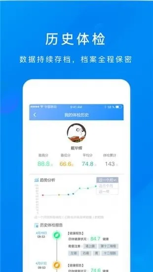 4. 贴心的细节设计:每日推送健康资讯;手机在线即时查看报告;有线上交互社区方便用户交流;体检报告查询步骤清晰,还能保存报告便于后续比对,且档案全程保密。