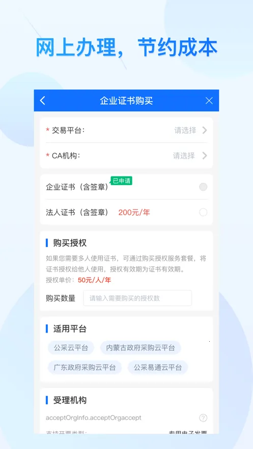 2. 申请超便捷:企业无需现场申请数字证书,下载手机APP就能完成流程,在线申请CA数字证书手机版,交易平台兼容传统媒体版和手机版,并行不冲突。