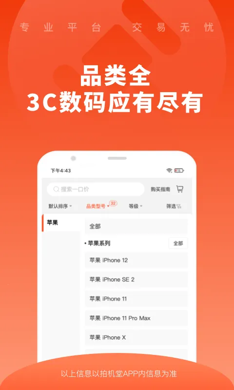 对于买家来说,最担心质量问题,拍机堂提供实时质检内容,让你看到的就是产品当前状态,购物更放心。而且能按品类型号等级等筛选商品,还能精准搜索,快速找到心仪数码产品。