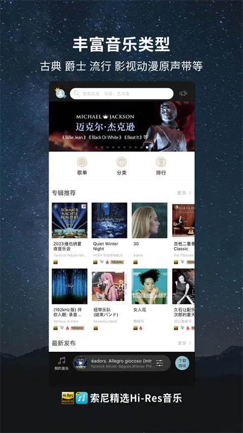 索尼hires音乐app由索尼中国官方出品,是高品质Hi-Res音频服务平台。汇聚数万首正版无损音乐,支持全格式解码、多端同步。有丰富功能,区别于主流平台,Hi-Res曲库超1万首,获正版授权,联动知名厂牌。