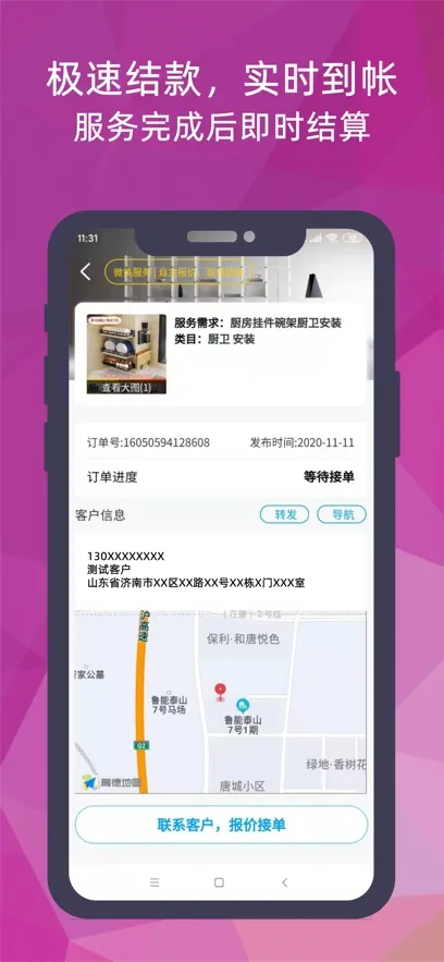 智能便捷,操作轻松具备智能派单功能,全国2000区域实时派单,3分钟内可获5个报价。全程线上操作,订单确认、时间预约、服务凭证上传等全流程轻松完成,还结合导航优化路线规划,让工作更高效。