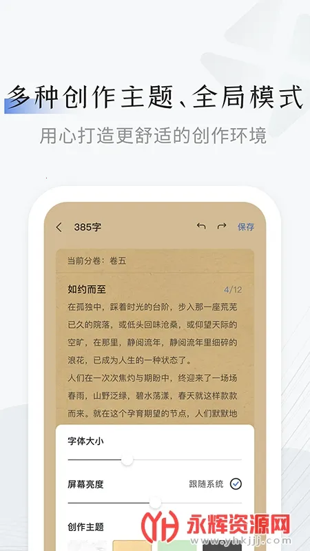 2. 创作环境舒适:提供多种创作主题和全局模式,打造个性化创作空间。