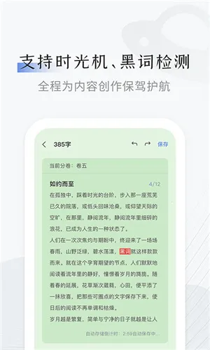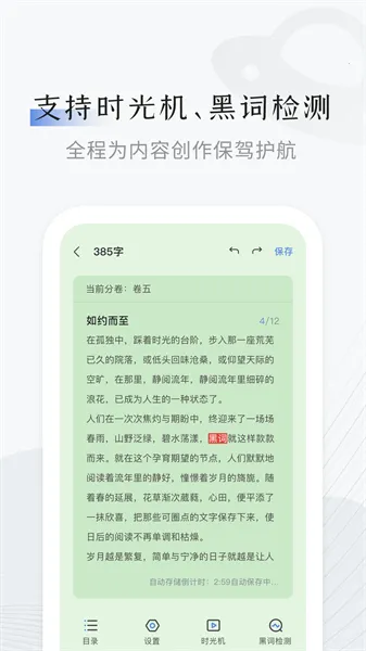 2. 保驾护航功能:具备时光机、黑词监测等功能,全程为创作内容保驾护航,让你能在舒适环境中安心创作。