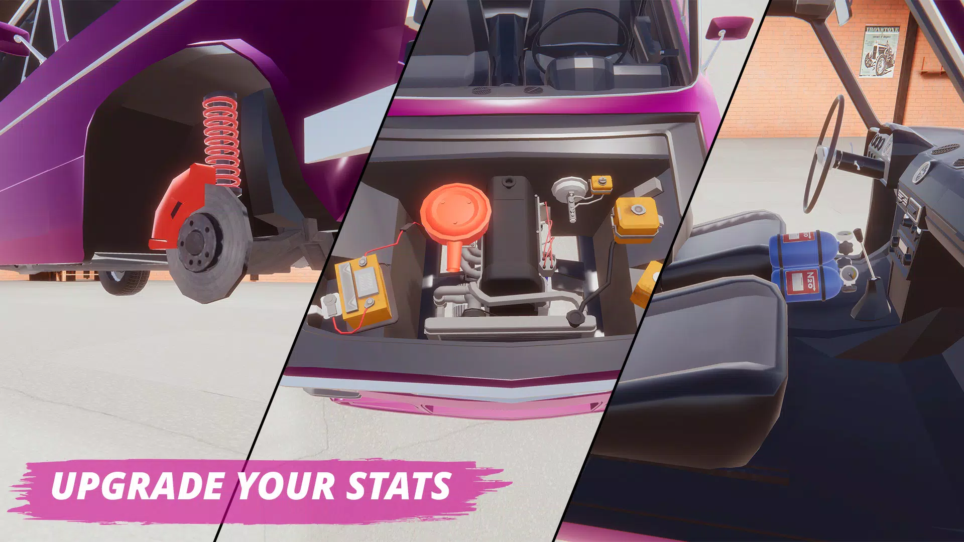 1、打造梦想之车:可从车库起步,拿起工具组装车辆各部件,从发动机到车身,还能安装升级各类零件,打造专属座驾。