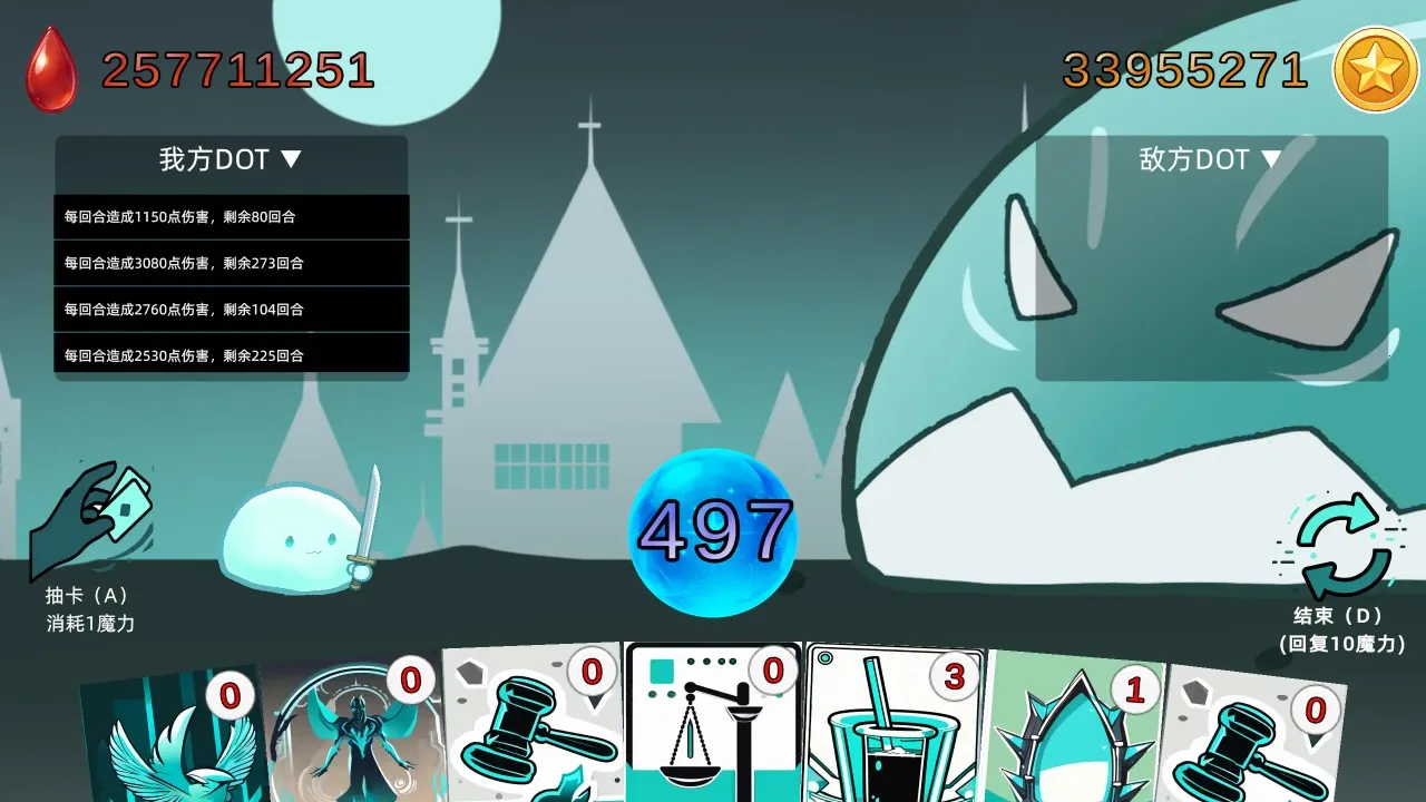 在毒雾沼泽深处,你操控剑术超群的剑勇史莱姆,与剧毒巨型史莱姆展开回合制卡牌对决。每回合自动恢复魔力,轮流抽牌出牌,用DOT效果持续伤害敌人,35张特色卡牌策略博弈,看你能否堆叠伤害碾碎Boss!