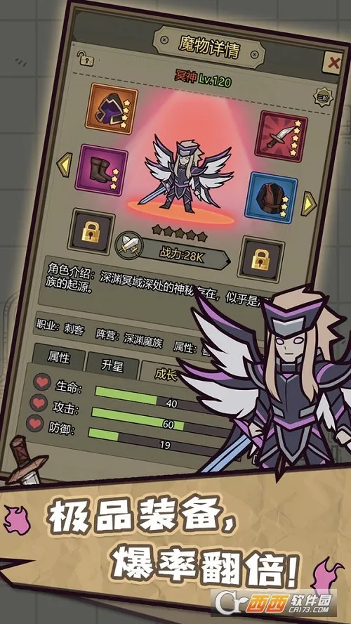2、多样玩法融合:融合了魔物培养、策略冒险、放置合成等玩法。通过不断打怪升级技能,解锁众多武器,还有全新收集方式可解锁不同角色等级,趣味十足。