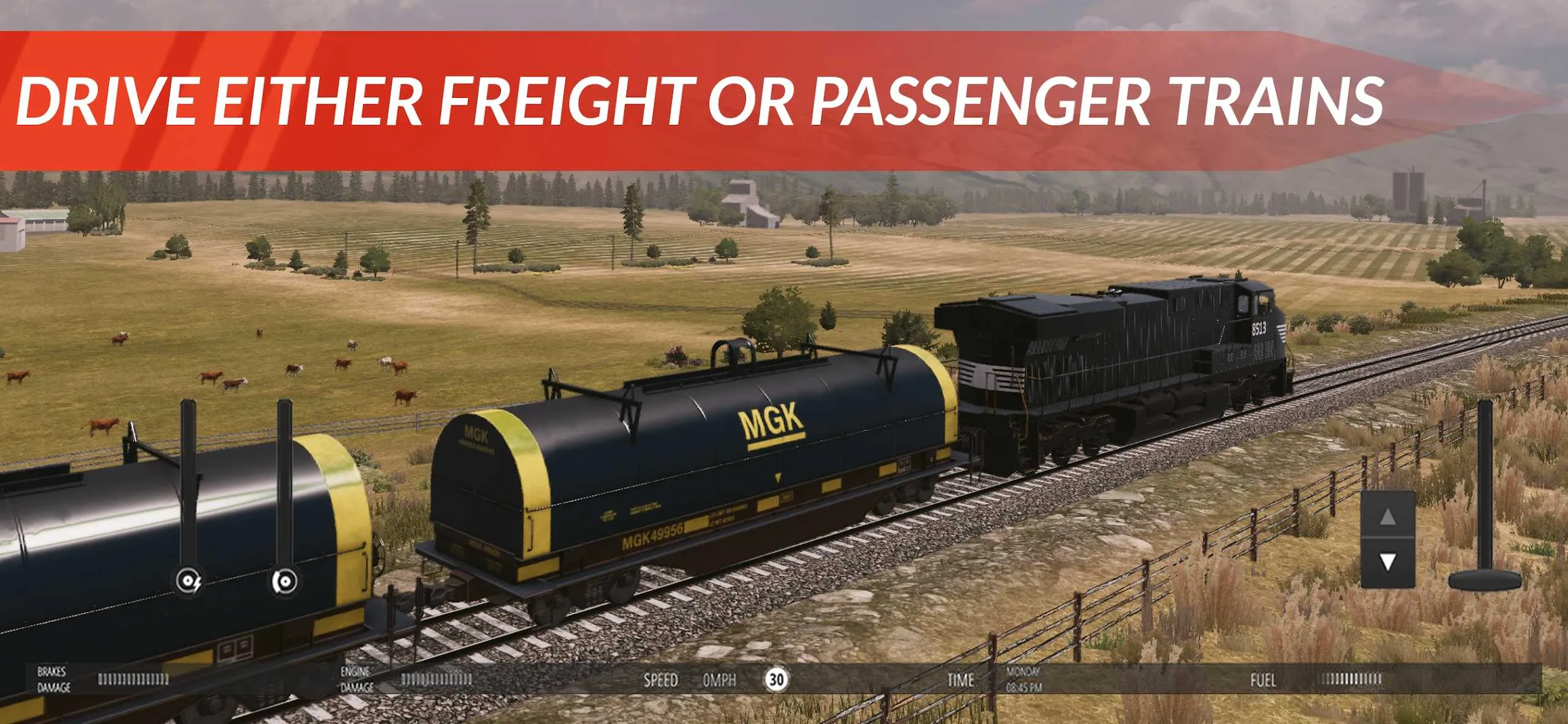 观赏美国自然景观:驾驶火车沿途欣赏美国的自然景观,如延绵山峰、沿途城镇等,感受大自然的美好,增添游戏乐趣。