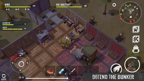 它的玩法丰富,通过摇杆移动,点击小手采集资源,点击按钮射击猎物。背包满了可回基地存物资,左下角自动功能能自动采集。能升级英雄,有50个角色等级可选。还能建设营地,挑选家具,勾选位置就能成功建造。