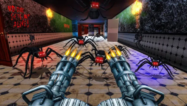 1、玩家以第一视角在荒岛使用无限弹药武器射击四面八方的蜘蛛怪物。