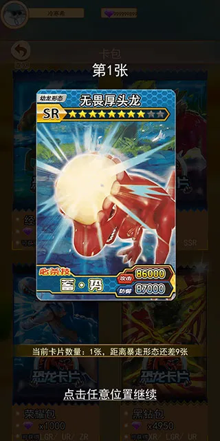4、当前卡片数量1张,距离暴走形态还差9张,点击任意位置继续。