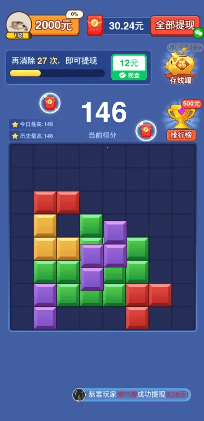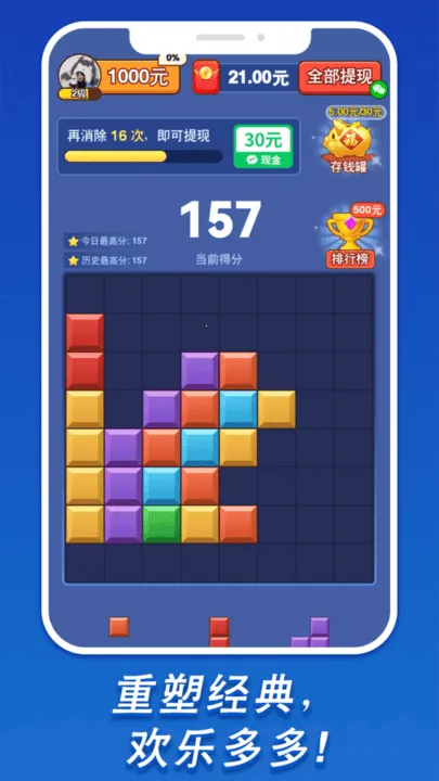 1. 丰富多样的奖励机制,让你在消除方块的过程中收获满满。连续消除可翻倍奖励,完成任务也能获得相应奖励,还有更多红包奖励等你来拿。