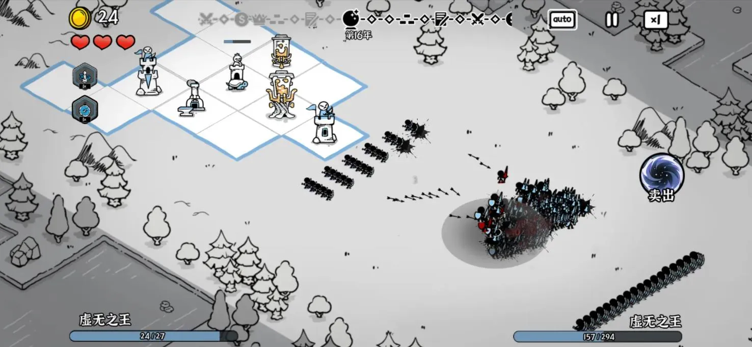 游戏玩法丰富多样,比如选择国王运筹帷幄,建造防御对抗敌人;点击开始战斗按钮闯关;放置城堡并选择兵种上阵,点击屏幕让城堡发射炮弹攻击。到了夜晚,角色还会转变,能化身为暗影之王潜入战场。