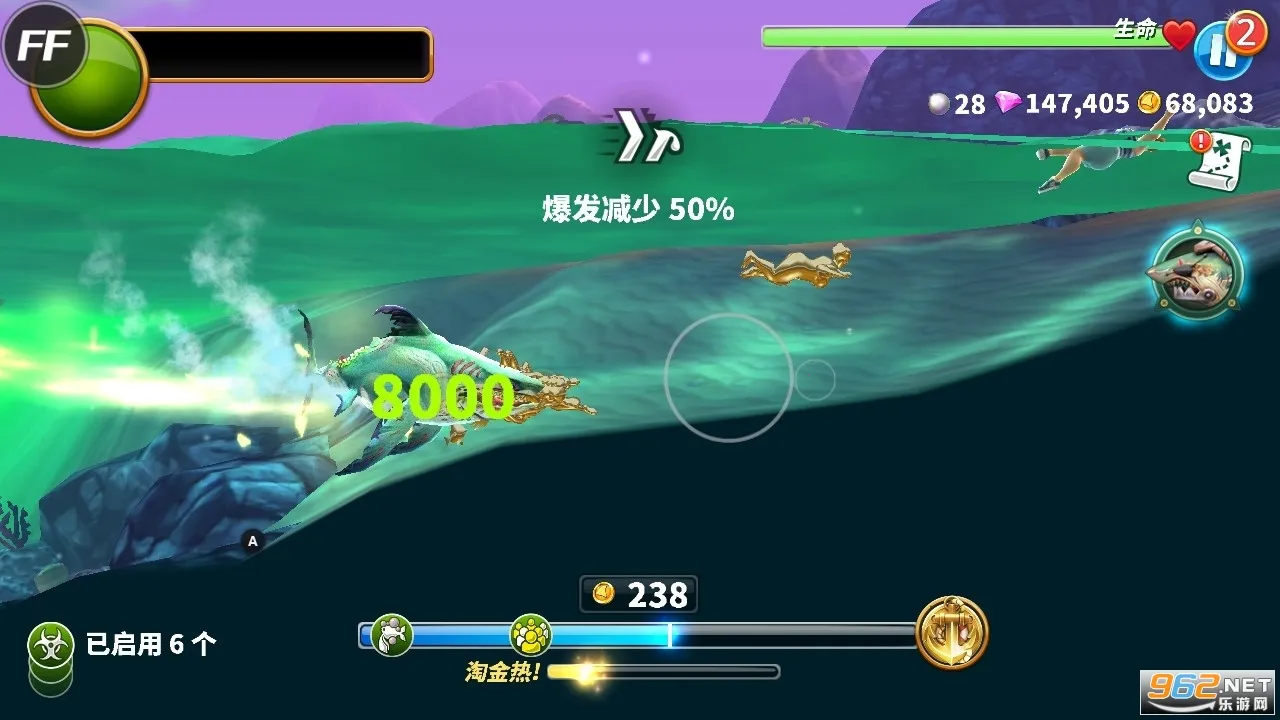 多样玩法:触摸屏幕控制鲨鱼加速移动,有生命值和加速能量条设定,要掌握速度与能量关系,还能解锁更多鲨鱼种类、升级能力,在不同场景获取道具金币等。