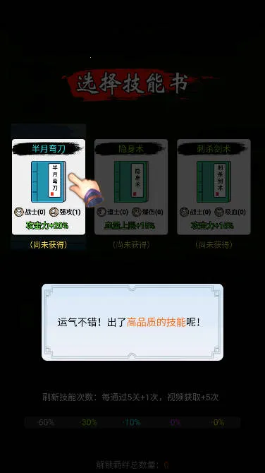 开局一把刀游戏有着独特魅力。它是全新挂机冒险战斗游戏,有独特天赋技能可解锁。打怪能掉装备,爆率超高,还能升级技能激活羁绊,有超多炫酷技能。操作简单爽快,随时随地能玩,离线挂机也有高额收益。水墨传奇风策略闯关,融入自走棋元素,过关需合理搭配技能阵容。打怪随机掉装备,支持装备合成。不同角色有擅长天赋技能,可搭配多种技能阵容。支持挂机放置玩法,离线也能获装备经验奖励,能让玩家尽情享受游戏乐趣,是一款值得尝试的游戏。