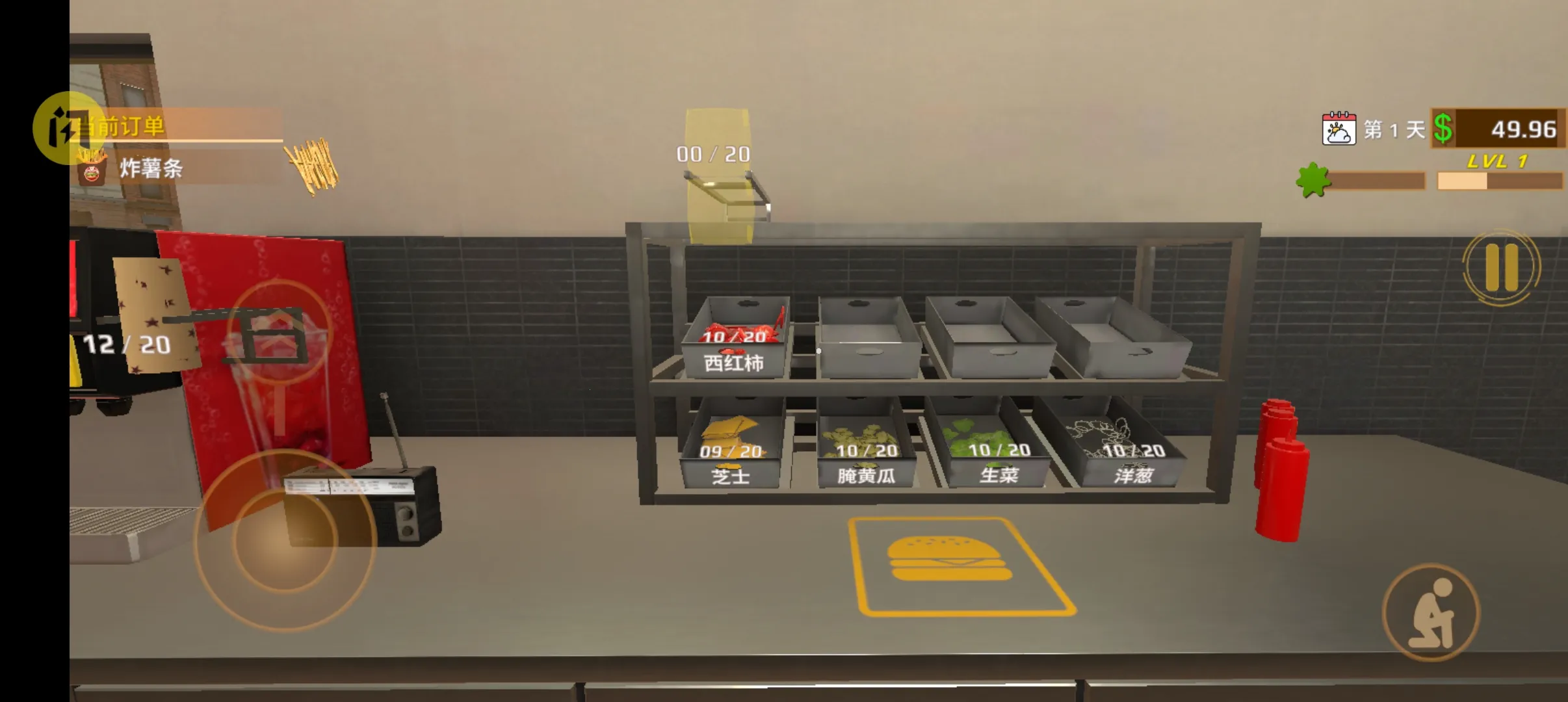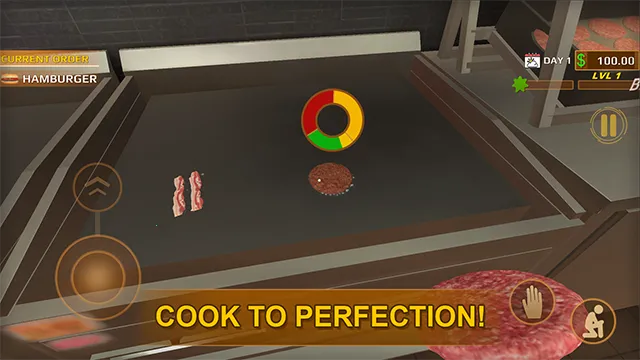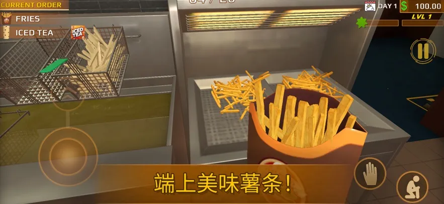 逼真食材与制作体验:使用新鲜食材烧烤并组装美味的汉堡,将金黄酥脆的薯条炸至完美,提供冰镇苏打水,真实模拟快餐制作全流程,带来沉浸式经营乐趣。