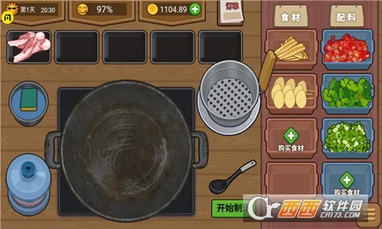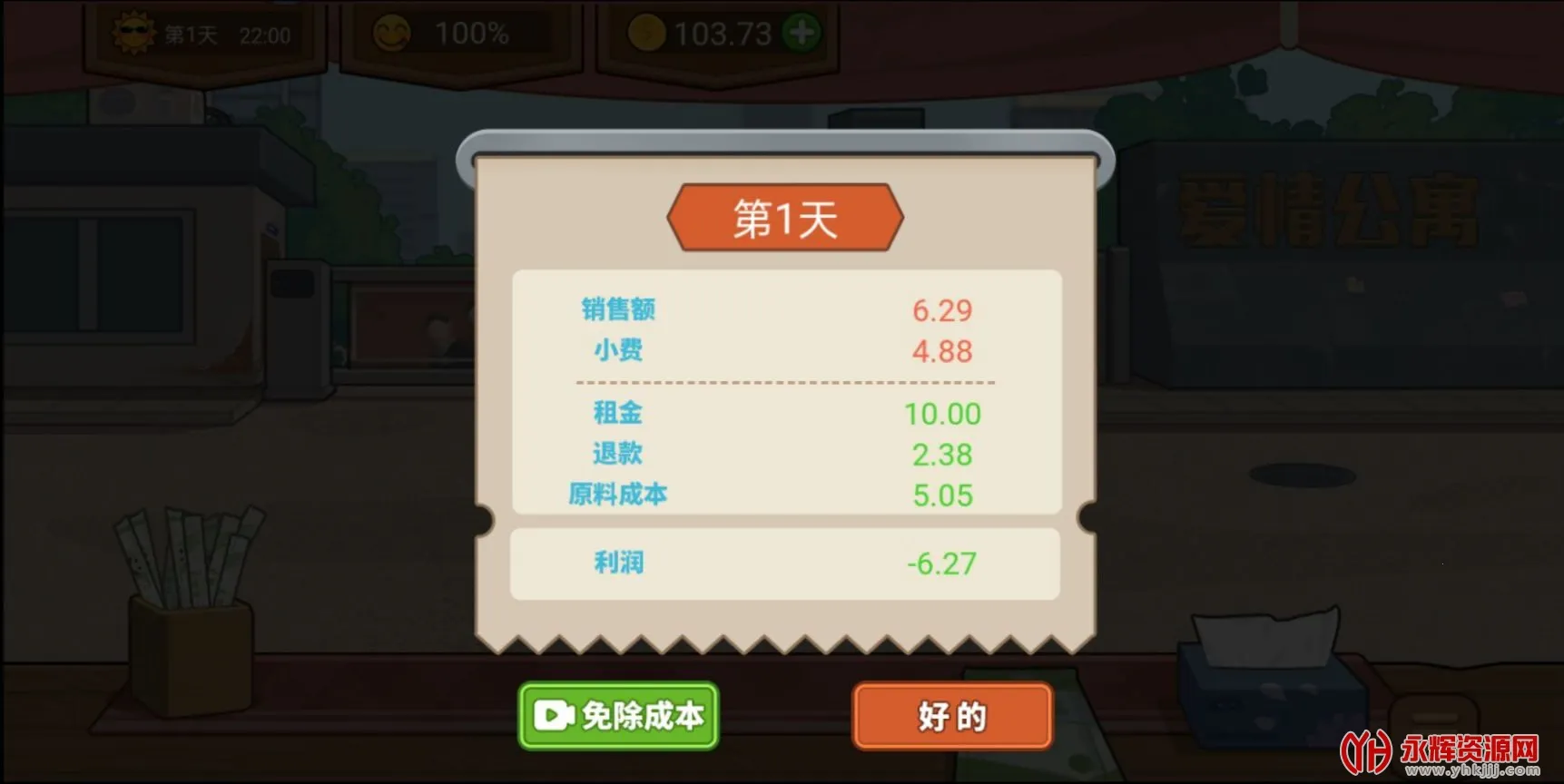 每日收摊结算,金币大于0可继续进入下一天,期间可购买材料和升级设施,购买的材料会自动扩充放置位置。
