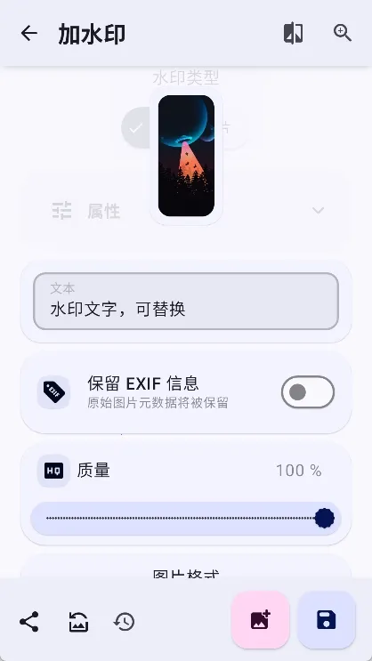 5. 提供个性化图片和文字水印功能,可自定义水印内容、透明度及大小。